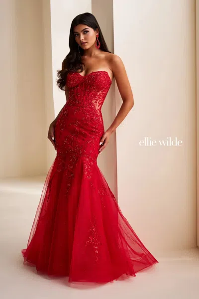 37085 Beaded Long Formal Lace Corset Mermaid Prom Dress In Red