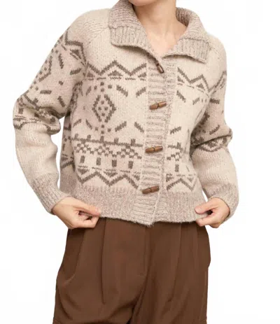 Mock Neck Fair Isle Printed Cardigan In Taupe Grey In Brown
