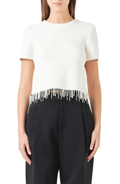 Imitation Pearl Hem Short Sleeve Sweater In Cream