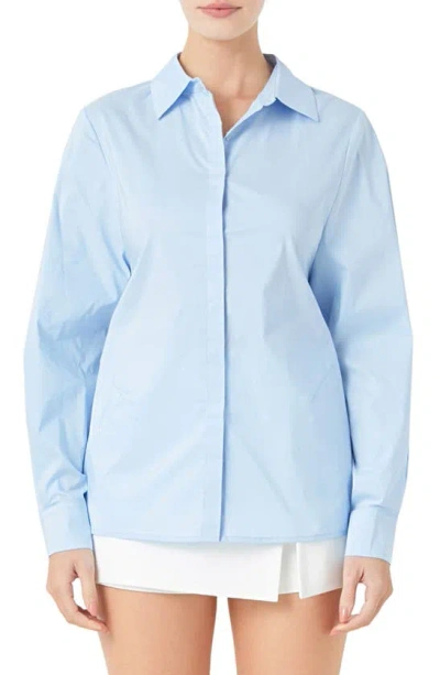 Elastic Back Detail Cotton Blend Button-up Shirt In Powder Blue