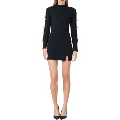 Rhinestone Bow Long Sleeve Sweater Minidress In Black
