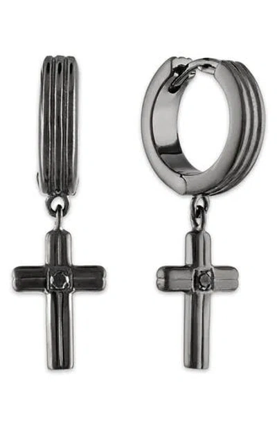 Black Diamond Cross Drop Huggie Hoop Earrings