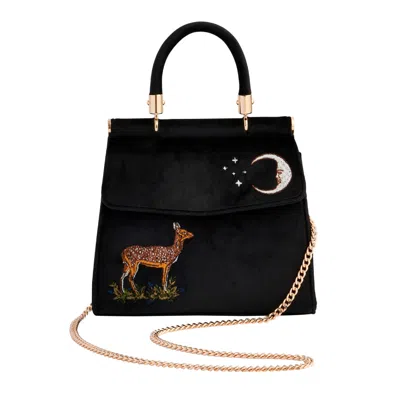 Women's Deer & Moon Embroidered Black Velvet Tote