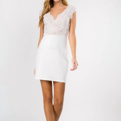 V Neck Lace Embellished Mini Dress With Stretched Ponti In Ivory In White
