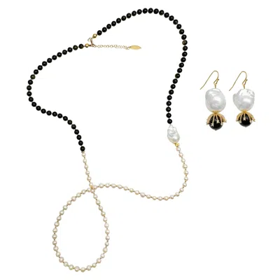 Women's Black Obsidian And White Freshwater Pearls Jewelry Set