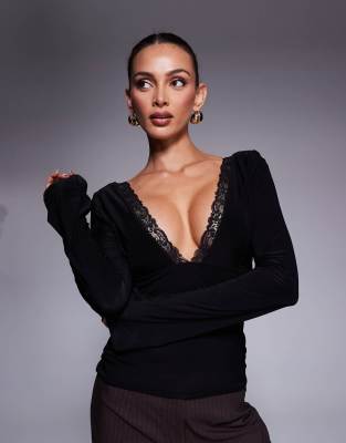 Slinky Double Layered Plunge T-shirt With Lace Trim In Black
