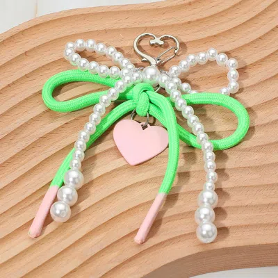 Heart Charm Dangle Double Pearl Beaded Loop Bow Keychain / Bag Charm In Green