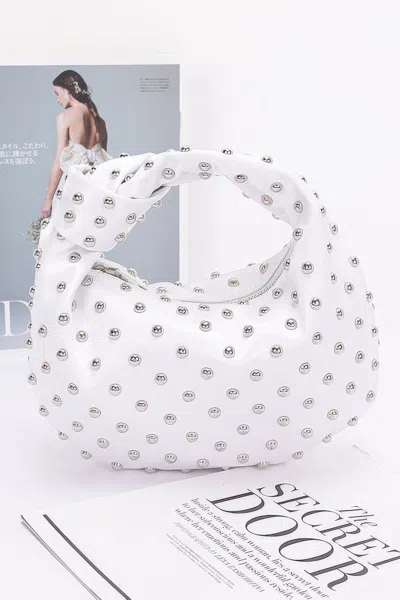 Satin Ribbon Round Rhinestone Metal Clutch In White