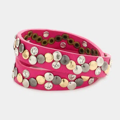 Crystal Hammered Metal Studded Faux Leather Band Bracelet Fuchsia In Pink