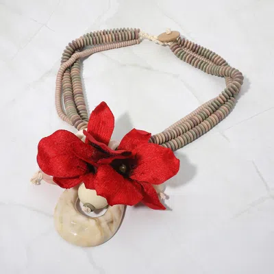 Bold Floral Pendant Accent Wooden Disc Beaded Layered Chain Statement Necklace In Red