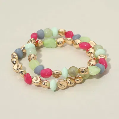 2pcs - Multicolor Pebble Beaded Stretch Multi Layered Bracelets In Pink