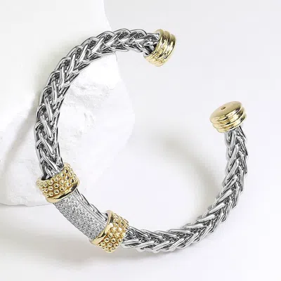 Cz Stone Paved Bar Pointed Two Tone Cuff Bracelet In Silver