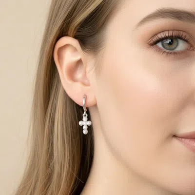 White Gold Dipped Center Pearl Cross Charm Drop Mini Huggie Hoop Earrings In Multi