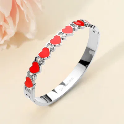 Stainless Steel Enamel Heart Cz Stone Hinged Bangle Bracelet In Silver