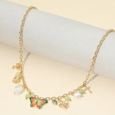 Enamel Butterfly Flower Cross Bow Heart Pearl Charm Station Necklace In Green