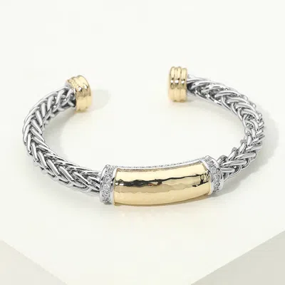 14k Gold Plated Two Tone Cz Pave Bar Accent Braided Cuff Bracelet In Metallic