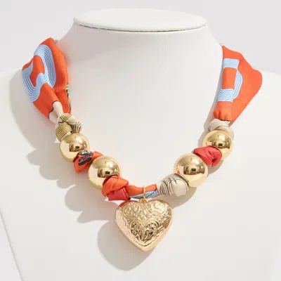 Gold Dipped Puffy Textured Heart Charm Accent Fabric Scarf Necklace Adjustable Bracelet Bag Charm