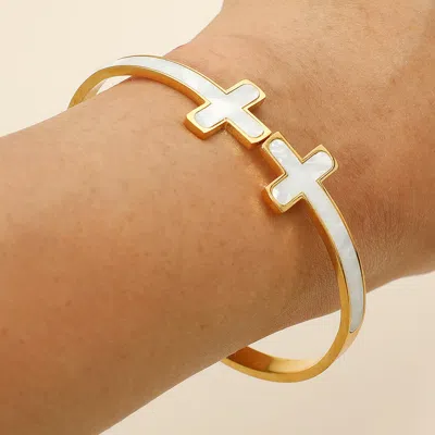 Stainless Steel Mother Of Pearl Double Cross Tip Hinged Bangle Bracelet In White