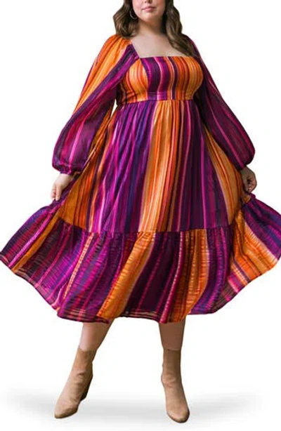 Metallic Stripe Long Sleeve Chiffon Midi Dress In Multi