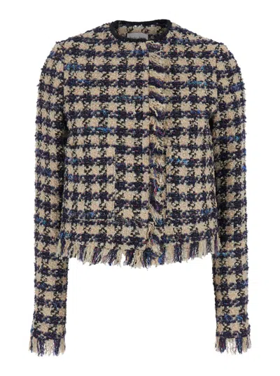 Beige And Blue Single-breasted Jacket With Large Houndstooth Motif In Tweed Woman In Multi