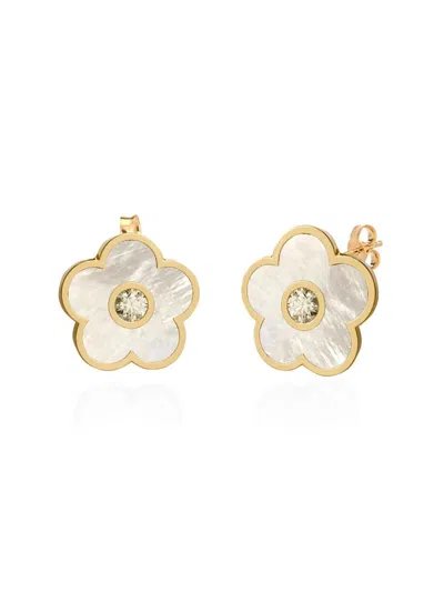 14k Over Silver Pearl Cz Flower Earrings In Gold