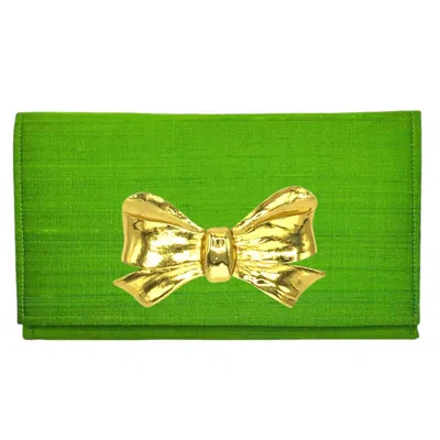 Women's Dupioni Silk Clutch With Customized Accent Big Bow In Emerald In Gold