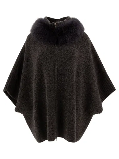 Wool And Cashmere Poncho With Fur Collar In Blue