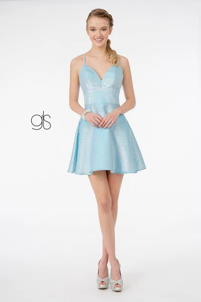 Glitter Crepe Deep V-neck Short Prom Dress In Blue
