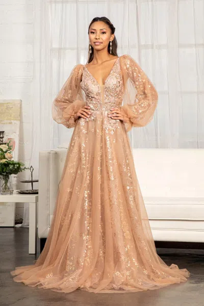 Long Sleeve Formal Glitter Evening Prom Dress In Brown