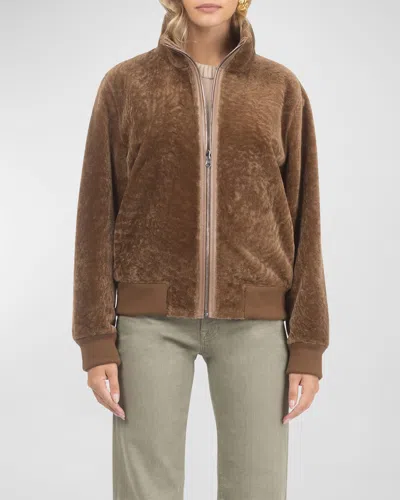 Reversible Textured Genuine Shearling Bomber Jacket In Brown