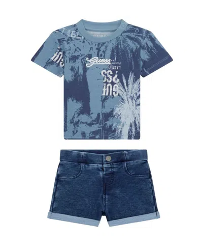 Baby Boy 2-piece All-over Print Short Sleeve T-shirt And Knit Denim Short In Blue