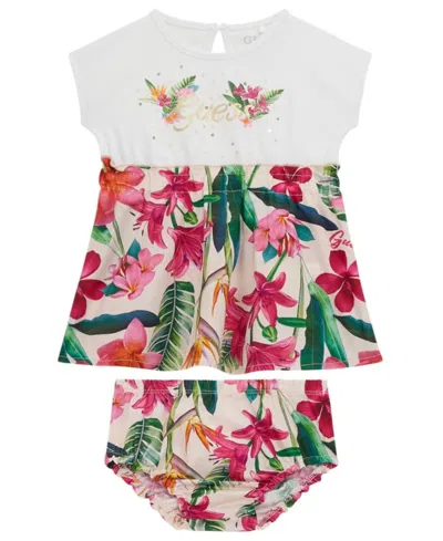 Baby Girls 2-piece Mixed Fabric Short Sleeve Dress With Printed Bloomer Set In Multi