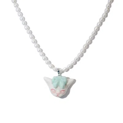 Women's White / Blue Grumpy Bunny Light Misty Blue Bow Tie Freshwater Pearl Necklace