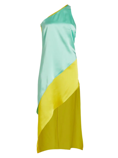 Razor One-shoulder Two-tone Satin Midi Dress In Aqua And Lemon