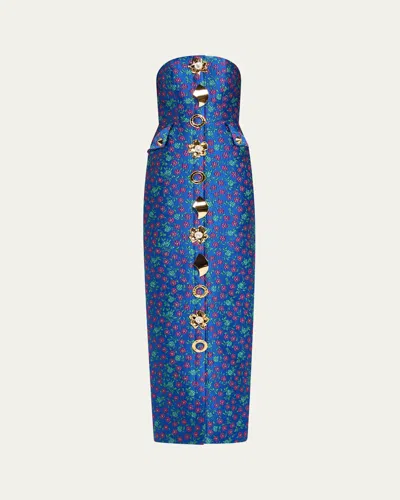 Quanta Floral Brocade Strapless Buttoned Gown In Lapis Brc