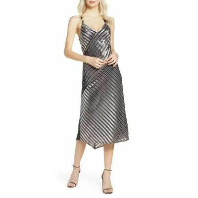 Metallic Stripes V Neck Cocktail Slip Midi Dress In Gray In Grey