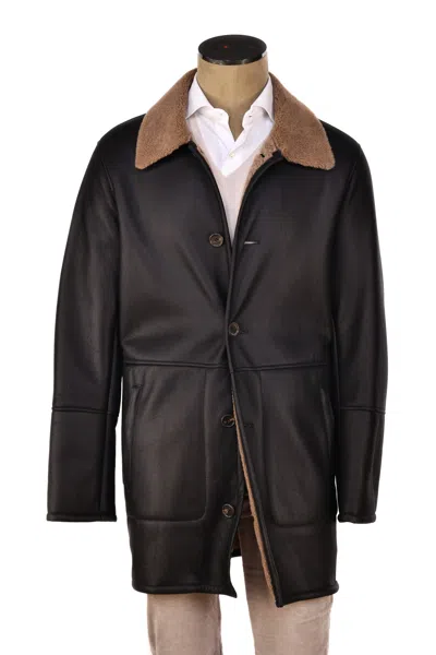 Isa Midnight Brown Leather Shearling Overcoat In Black