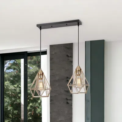 Kitchen Island Geometric Two Light Iron Flush Ceiling Light With Gold Shades In Blue