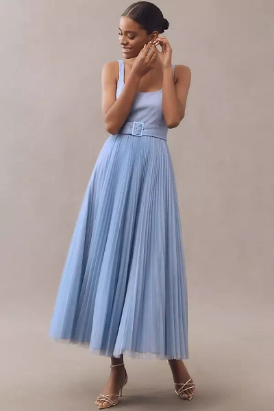 Effy Sleeveless Square-neck Belted Pleated Tulle Maxi Dress In Blue
