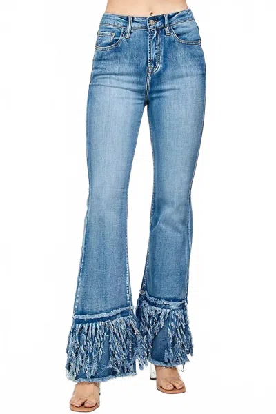 High Rise Frayed Flare Jeans In Medium Wash In Multi