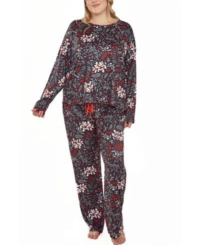 Plus Size Ultra Soft Floral Print Top And Pant Pajama Set In Black