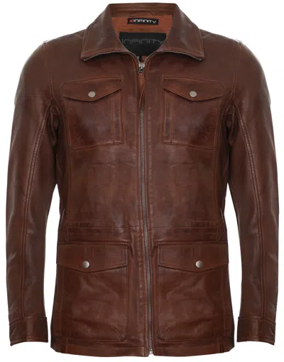 Pre-owned Men's Tan Brown Leather Jacket Safari Casual Multi-pocket Trench Jacket