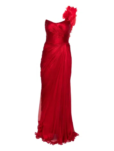 Clarice Asymmetric-sleeve Draped Maxi Dress In Red