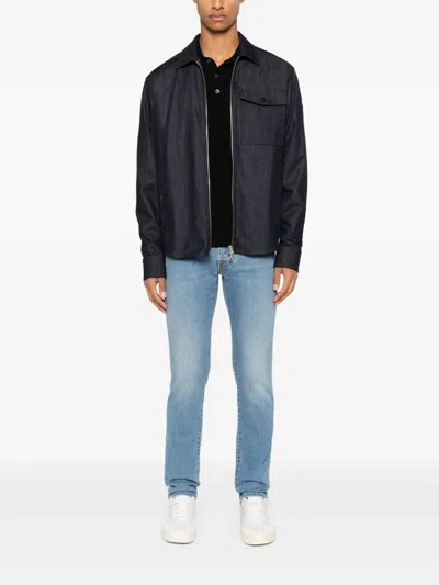 Slim-fit Jeans With Branded Button And Velvet Logo Patch In Blue