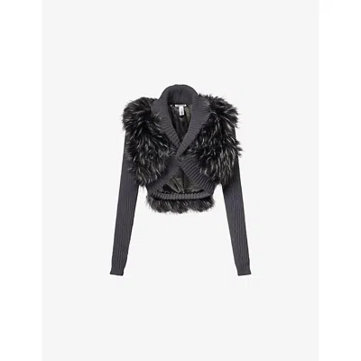 Womens Grey Faux-fur Long-sleeves Knitted Shrug In Multi