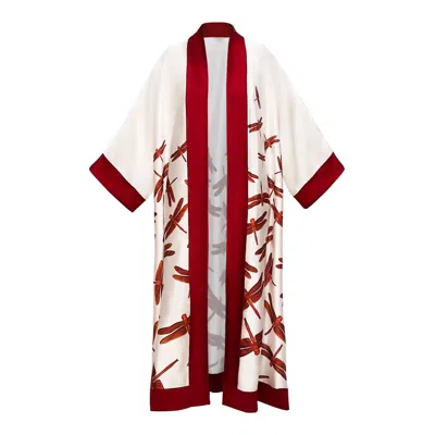 Women's White Red Dragonfly Satin Long Abaya Kaftan