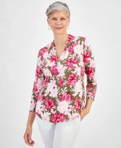 Petite Linear Gardenâ V-neck 3/4-sleeve Top, Created For Macy's In Army Green Combo