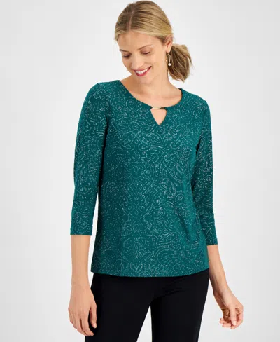 Plus Size 3/4-sleeve Jacquard Top, Created For Macy's In Pure Emerald Combo