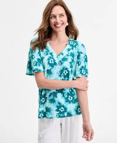 Women's Printed V-neck Short Sleeve Knit Top, Exclusively At Macy's In Blue