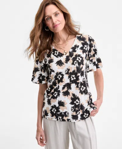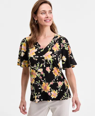Women's Printed V-neck Short Sleeve Knit Top, Exclusively At Macy's In Black